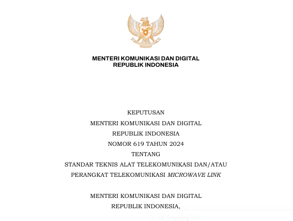On December 10, 2024, the Minister of Communication and Digital (KOMDIGI) of the Republic of Indonesia, Meutya Viada Hafid signed the DECREE OF THE MINISTER OF COMMUNICATION AND DIGITAL OF THE REPUBLIC OF INDONESIA NUMBER 619 OF 2024 CONCERNING THE TECHNICAL STANDARD FOR MICROWAVE LINK FOR THE PURPOSES OF CERTIFICATION OF TELECOMMUNICATION EQUIPMENT AND/OR TELECOMMUNICATION DEVICES related to the telecommunication device certification matters within the Directorate General of Digital Infrastructure (DJID).
